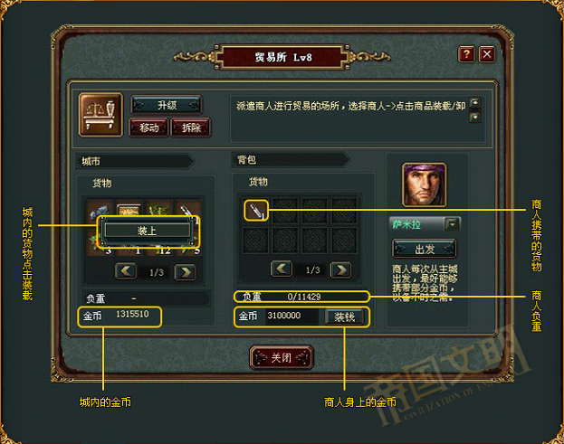 装载货物:商人在贸易所可以进行装载货物:选择点击货物点击装载