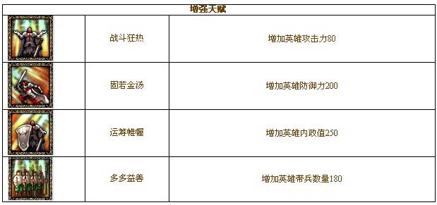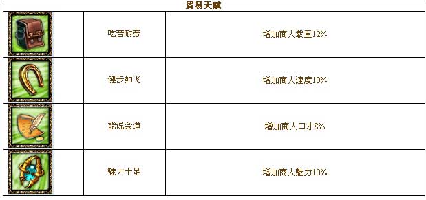 当玩家获得一定功勋后,即可获得相应军衔,当军衔提升至3,6,9,12级时将获得2点天赋点数。天赋点数可用于学习以下天赋。 天赋能力主要分为:能力天赋、贸易天赋、增强天赋、文明天赋、技能天赋、统帅天赋。 每种天赋需求一定等级的军衔,玩家满足条件后可使用获得的天赋点数加点。 每页天赋最多可学习两种。 天赋界面,可以在左上角,点击图标呼出。