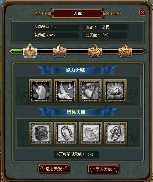 (天赋)。玩家每提升功勋名称3级后,可获得2点天赋点进行自由分配。(遗忘天赋功能将于后续版本添加)